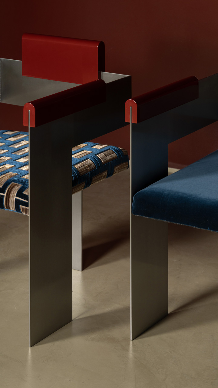 Delicate seating fabric softens the overall look, while lacquered wooden tops on the