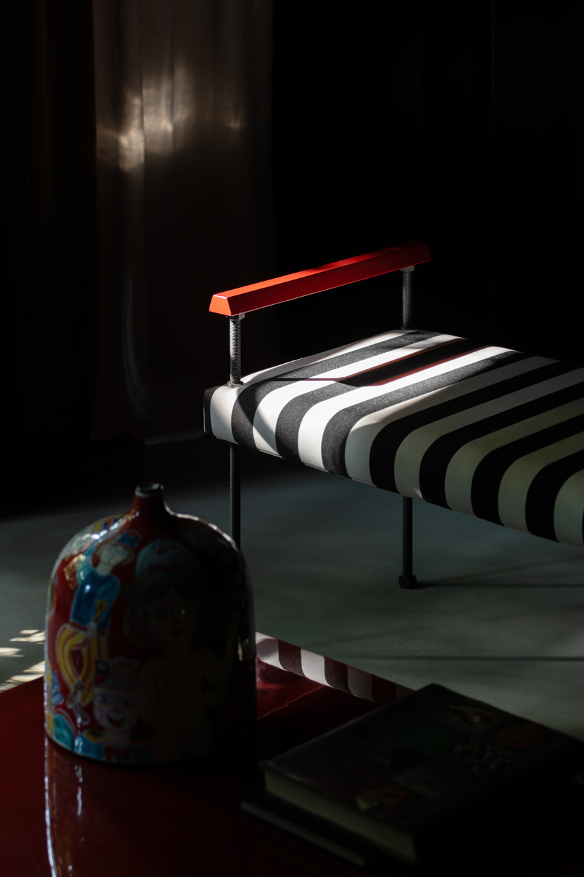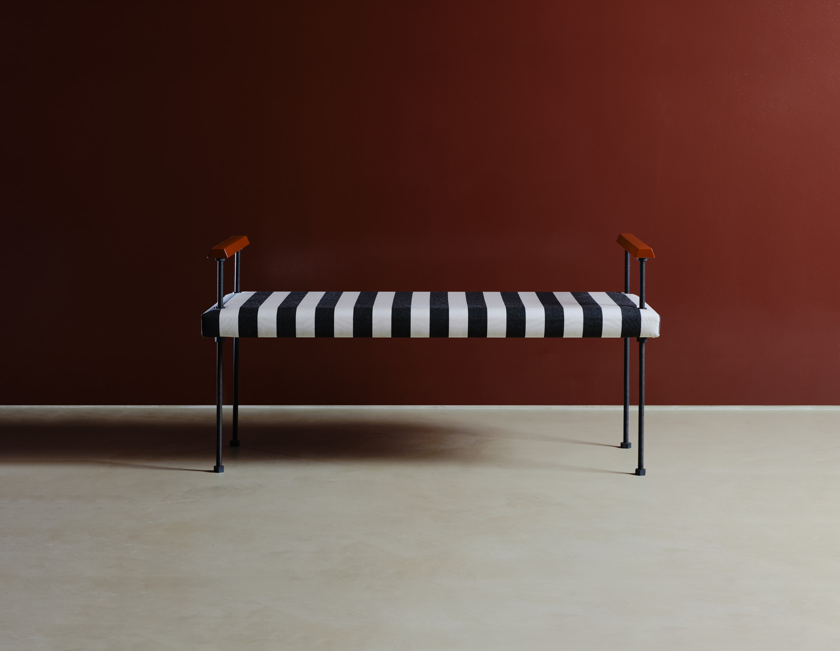 white striped textile, infuses the bench with a contemporary and minimalist elegance.