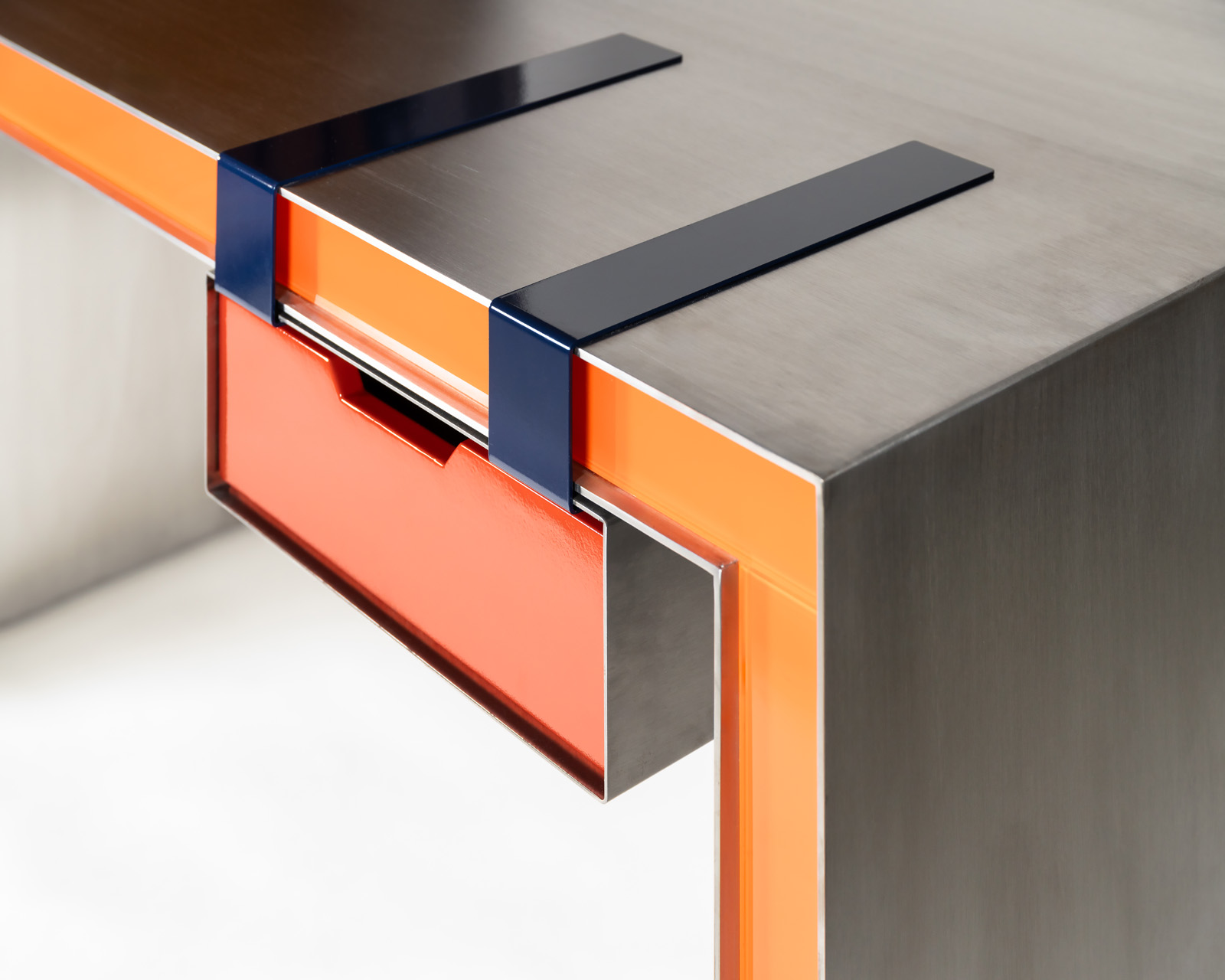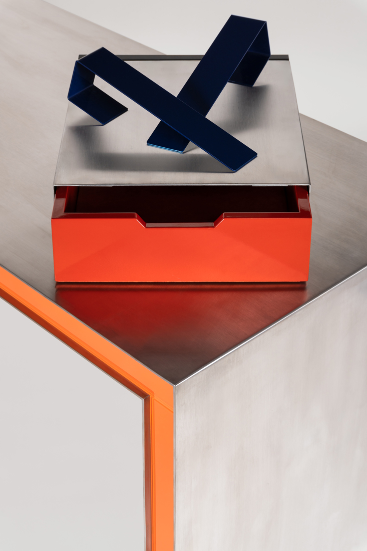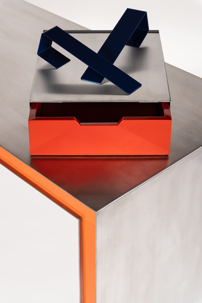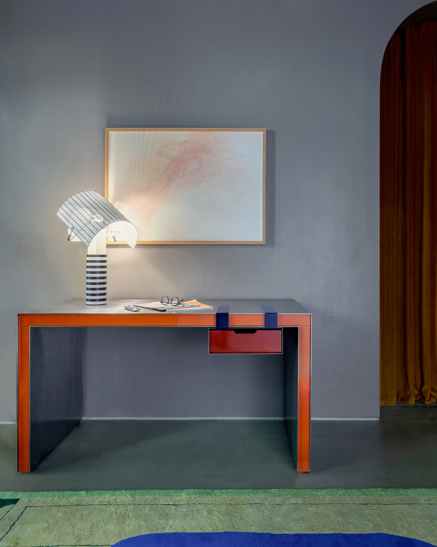 The Clip Desk/Console is a vibrant fusion of polished steel, painted glass, and lacquered