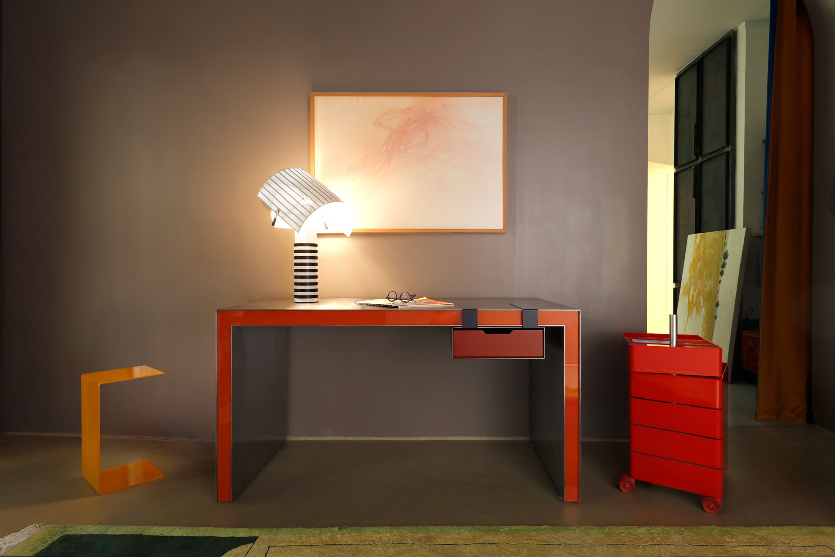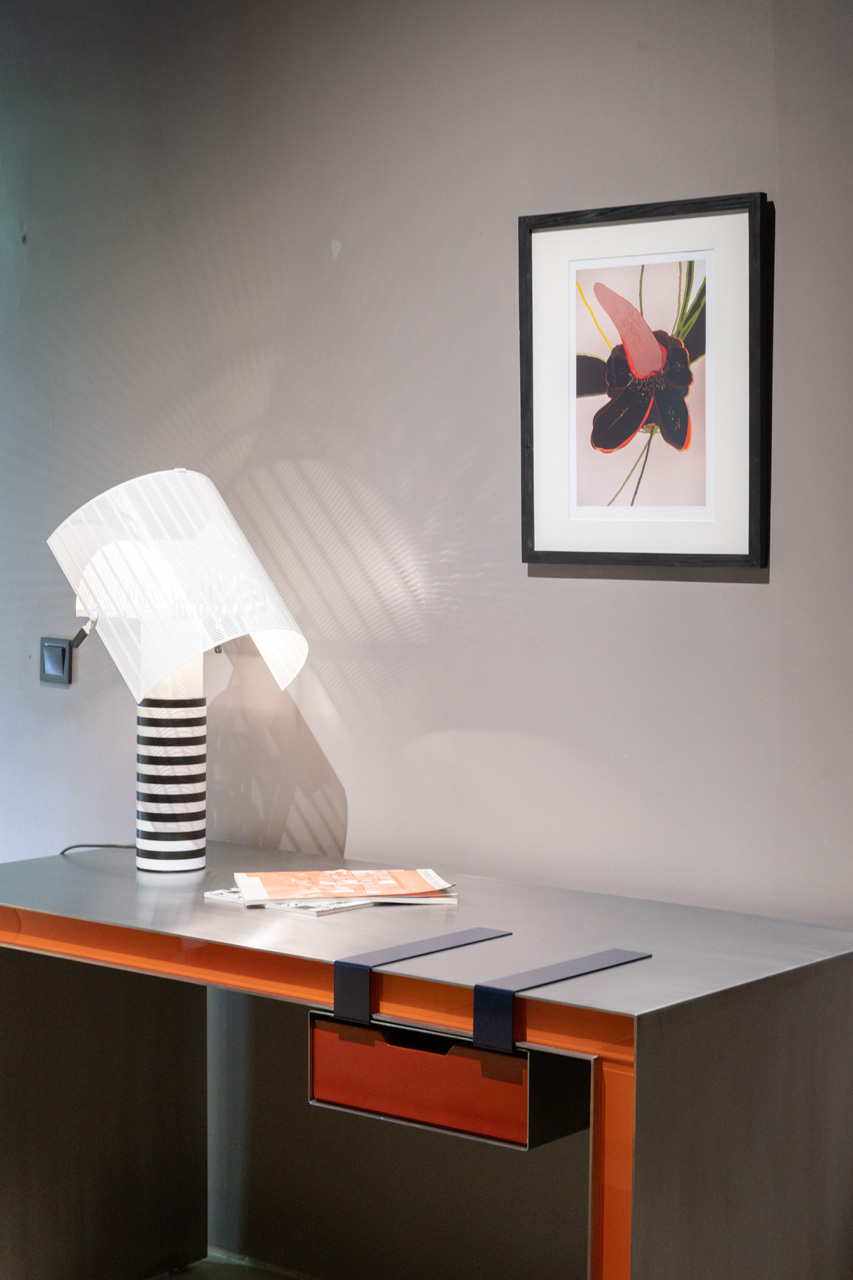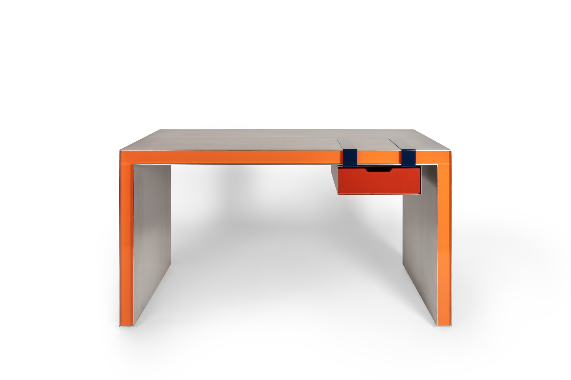 The Clip Desk/Console is a vibrant fusion of polished steel, painted glass, and lacquered