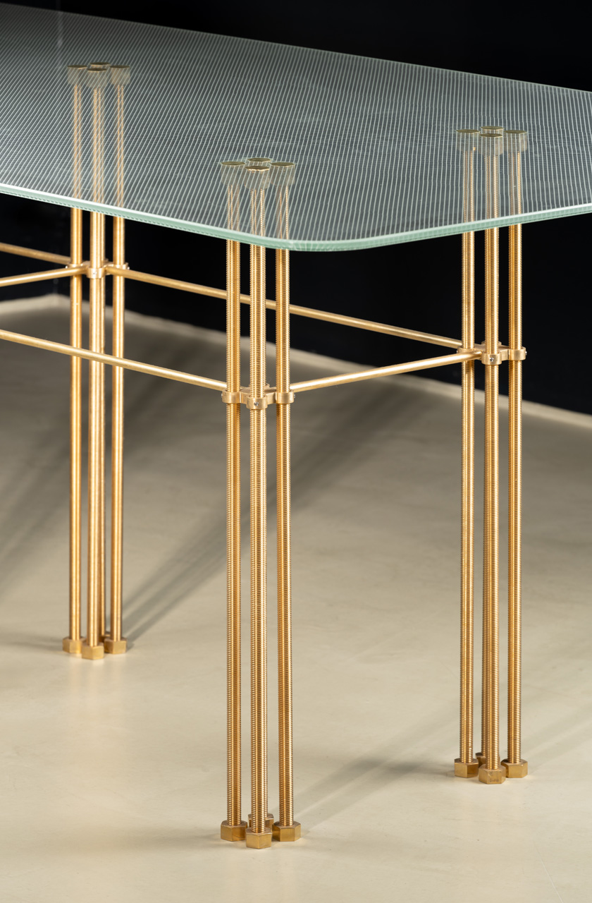 with grace and refinement.Complementing the delicate glass top are brass legs crafted