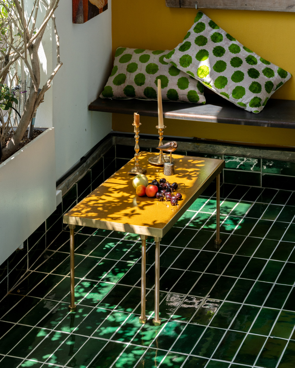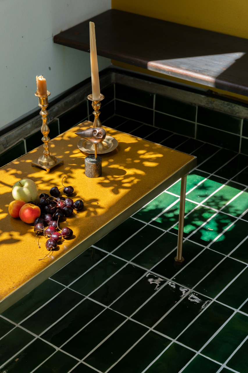 while its top features a glazed Persian ceramic tile,made using traditional techniques, a tribute